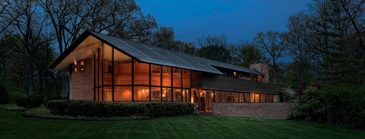 The Charles Glore House in Lake Forest, Illinois was built in 1954. The Usonian style home features  Frank Lloyd Wright trademarks like clerestory windows, built-in bookshelves, mahogany panels, four fireplaces (three of which are cantilevered), and an abundance of brick. The home also incorporates some updates, including an expanded dining room after enclosing a deck, new windows, and grey concrete floors in place of the badly patched-up original red radiant-heat floors — via Curbed