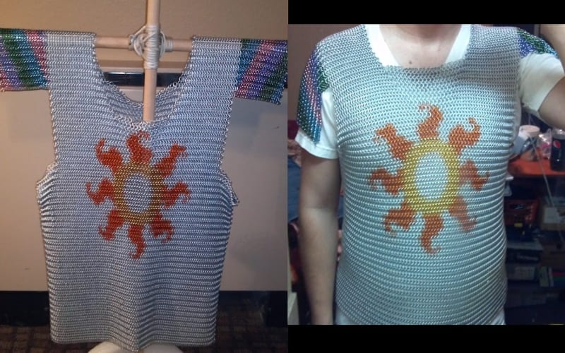 This Chainmail vest is themed around Princess Celestia the vest is mainly a frost white to match her coat and has her Cutie Mark adorning both the front and back. The shoulders are in the colors of her mane and tail and they were done in a diagonal pattern, but I noticed when they drape over the shoulder they appear to curve/wave which I thought was cool. I didn’t feel like making full sleeves for several reasons so these shoulder pieces are more for a flourish — via deviantART