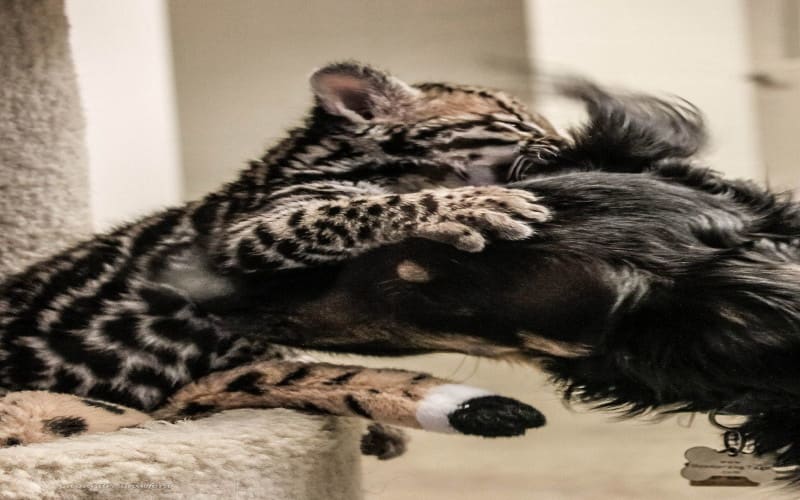Santos, Cincinnati Zoo‘s little Ocelot kitten, he has grown up from a tiny ball of fuzz into a healthy and playful young hunter. Here he is having a great time with his canine playmate, Blakely — via ZooBorns