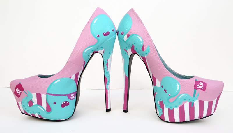 I love it when someone orders a pair of octopus shoes! This is my fifth pair of octopus shoes so far, it’s been really fun to think up different ways to do the same theme. For this particular pair, the customer wanted pirate octopi in her fav colours; pink and aqua/turquoise — via Pony Chops