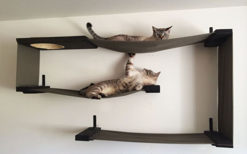 This piece has 5 wooden planks and one 18” shelf with hole cut into it to access it from underneath. Its hole is an extra large hole and lined with sisal. The entire piece comes 11” away from the wall. Attaching all of the shelves is a stiff bottomweight fabric. Each post is very strong and reinforced with three layers of board and attach to the wall with large 4” brackets. Each raceway is built to be mounted between 16” studs — via Etsy