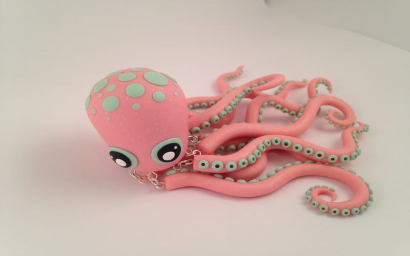 Plush is a somewhat friendly octopus hand made from bubblegum pink and mint green polymer clay. Each leg is jointed to the body with metal eye rings and jump rings. The hardware is reinforced with glue making it sturdy for versatile positioning — via Etsy