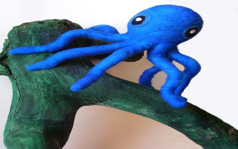 This is needle felted octopus on a real wood branch. Tree branch is painted with acrylic. The octopus is made from wire and roving which is shaped with a barbed needle and then glued on the branch with Weld Bound glue. The wood is from nature but has been thoroughly cleaned with hot salty water and wool steel. Ready to hang with hanging wire. This piece takes two nails to hang on wall. Some of his legs are moveable. Colours of this piece are bright blue, green, white, and black — via Etsy
