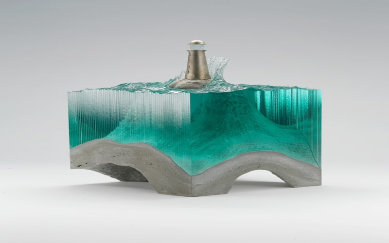 Laminated clear float glass with cast concrete base and cast white bronze lighthouse. H 450 x W 250 x D 250mm — via Broken Liquid
