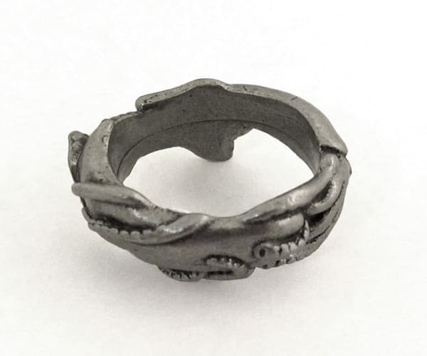 This ring depicts the epic encounter of the sperm whale (Physeter macrocephalus), and the giant squid (several species in the genus Architeuthis), as they grapple in the abyss. This primal encounter between indomitable Leviathan, and the mysterious Kraken has long stirred our collective imaginations, and now you can wear it on your hand — via Etsy