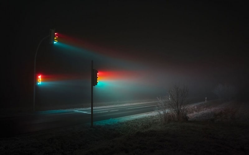 Who knew that the humble, utilitarian traffic light could look so haunting—and beguiling? As seen through the lens of Lucas Zimmermann, they take on an otherworldly aspect, their red, yellow, and green lights casting an altogether ghostly aura that emanates like a very basic rainbow in a dark, foggy sky.