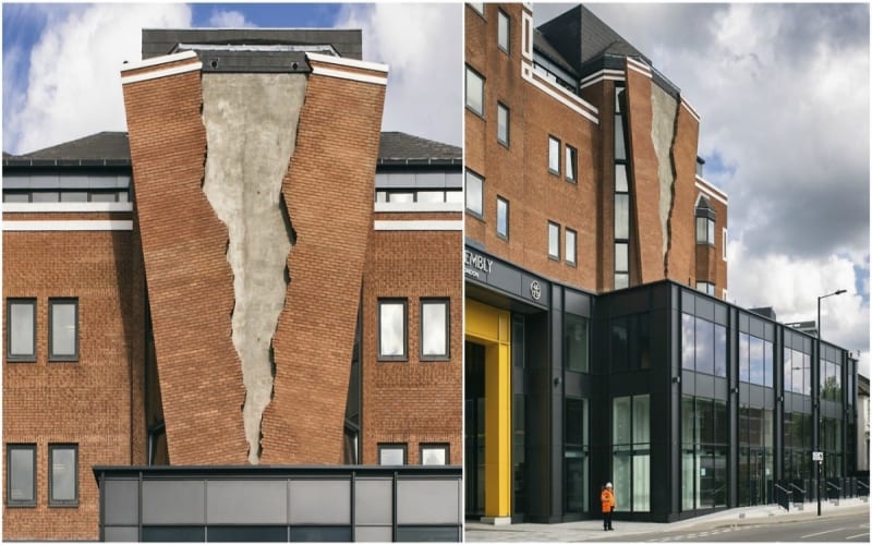 The work of artist Alex Chinneck is grounded in architecture. His latest work (and first permanent sculpture), Six Pins and Half a Dozen Needles, taking the form of a large brick wall ripped down the centre — via ArchDaily