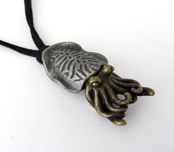 This pendant captures the spirit and beauty of the enigmatic cuttlefish in an attractive two-toned finish. The intricately patterned mantle (muscular outer covering) of this cuttlefish is cast in antiqued pewter, while the arms, body, and underlying anatomy are rendered in antiqued brass. This pendant is not just an adornment, it is also a carefully researched educational keepsake. If you pull on the arms of this cuttlefish, its head and body pull free of its mantle, revealing its internal anatomy. The cuttlebone, gills, branchial and systemic hearts, and all of of the other organs are rendered in minute detail. Let go of the arms, and the head and mantle snap back together — via Etsy