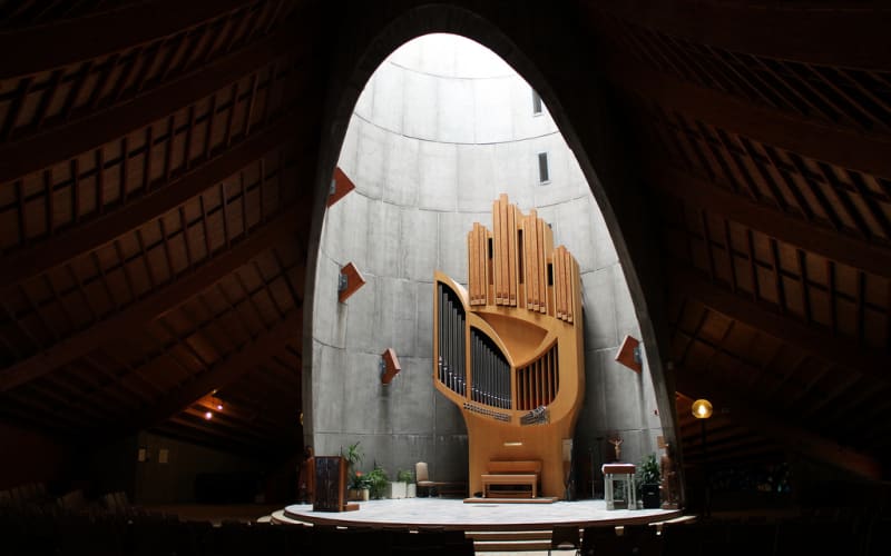 Notre-Dame des Neiges, a church in the resort town of L’Alpe d’Huez in the French Alps, has this unusual pipe organ. Jean Guillou, a master organist, designed it in 1978. The German organ builder Detlef Kleuker built it. Appropriately for a church, the shape of the organ is supposed to represent the hand of God. You can hear recordings of performances made on the organ at Pleasure of the Pipes and American Public Media — via Neatorama
