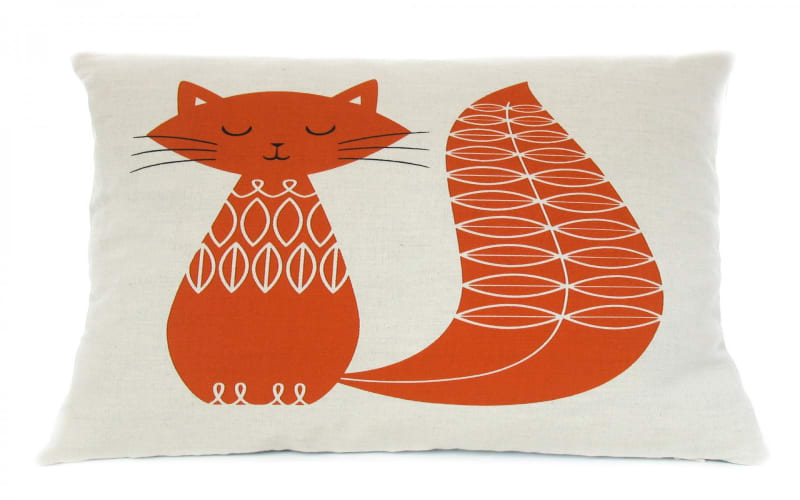 A Cat Cushion in burnt orange by Robin & Mould. This hand-made cushion (complete with filler) has a dashing orange cat hand-printed on a natural linen woven in the UK. It is printed using only 100% solvent-free waterbased ink; has a warm grey linen/cotton back and is finished with a concealed zip — via Howkapow