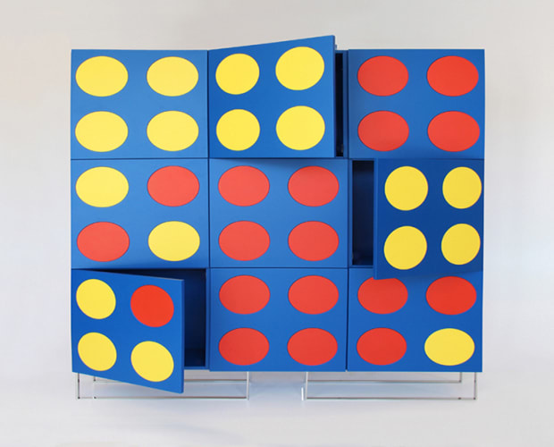 Designed by Luca Valota, it’s deliberately intended to imitate the game — first sold in 1974 — from its blue grid to the yellow and red tokens. However, this cabinet is made from lacquered polished MDF rather than plastic and stands at a slightly more imposing two metres. And within the grid you get nine different cupboards, meaning it’s vaguely practical too. But it doesn’t just look like Connect Four, you can actually play the game using the cabinet as each counter twists free and can be moved around, or taken out entirely as you can see on the image below.
