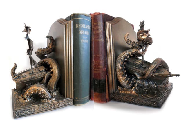 Set of Bookends depicting a Kraken attacking a ship at sea — via Etsy