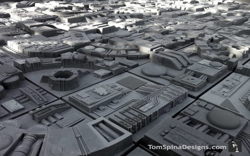 , with layers of smaller detail as a bonus for folks who look more closely at the home theatre’s walls. We also created a number of custom mannequins for replica movie costumes the client owned. As an alternative to ill-fitting mass-produced mannequins, we created customized, dynamically posed forms to capture the characters! A museum style base completed each display. For more work like this, please visit our Custom Mannequins and Displays page Want truly unique, hand-made custom décor for your home or office? Contact us today! Each master tile was moulded and expertly cast in tinted resin by Lonnie Hale. From there, details were randomly highlighted in colours chosen by the home’s decorator, to help add a sense of variation to the 120 finished tiles that would be applied to the walls — via Tom Spina Designs